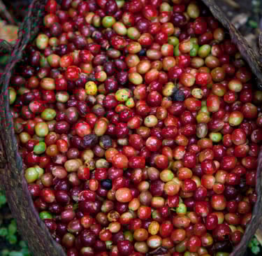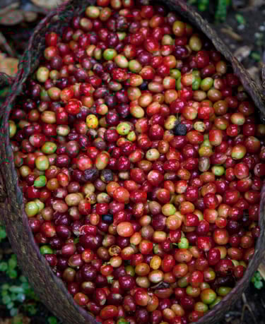 Basket of ripe coffee cherries picked off mountain forest plots cleared for coffee cultivation. Sheko Woreda
