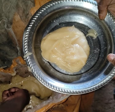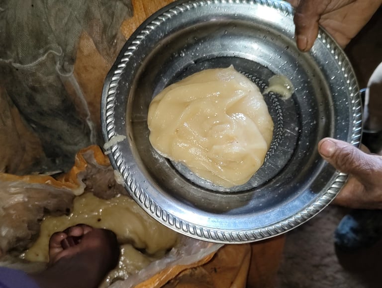 (image: Getemé honey, made from the nectar of the schefflera abyssinica tree is a prized honey from this region. The white colour and creamy texture, means this sweet honey is in high demand.)