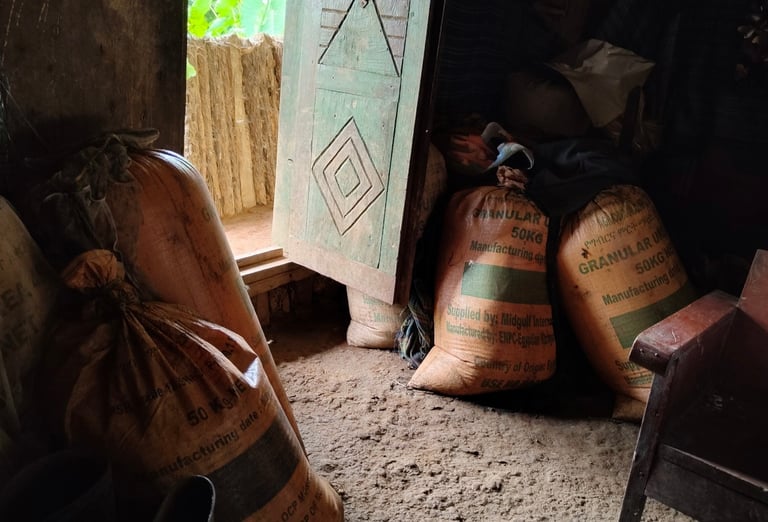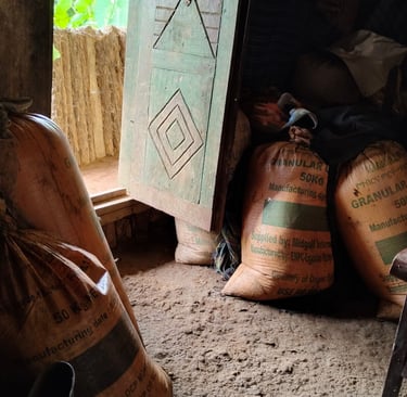(image: Sacks of geteme honey stored in a home while the beekeeper waits for the honey price to rise so that he can make more money.)