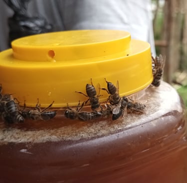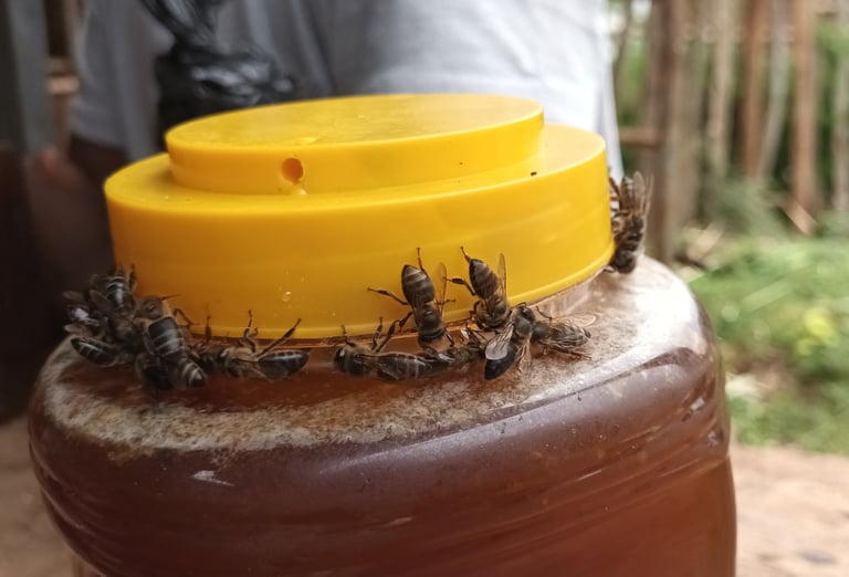 (image: Honey is sold locally through traders and union shops in plastic bottles.)