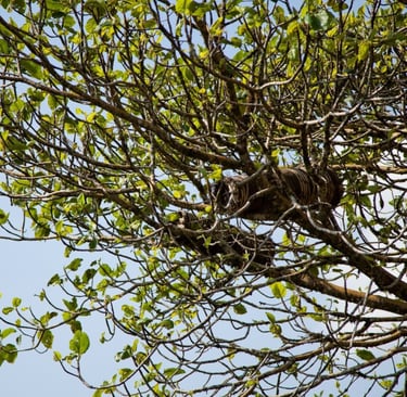 (image bottom: The monkey’s chair tree (Polyscias fulva) is a favoured tree for hanging beehives as its straight trunk is difficult for predators to climb and the branches can support many hives with ease.